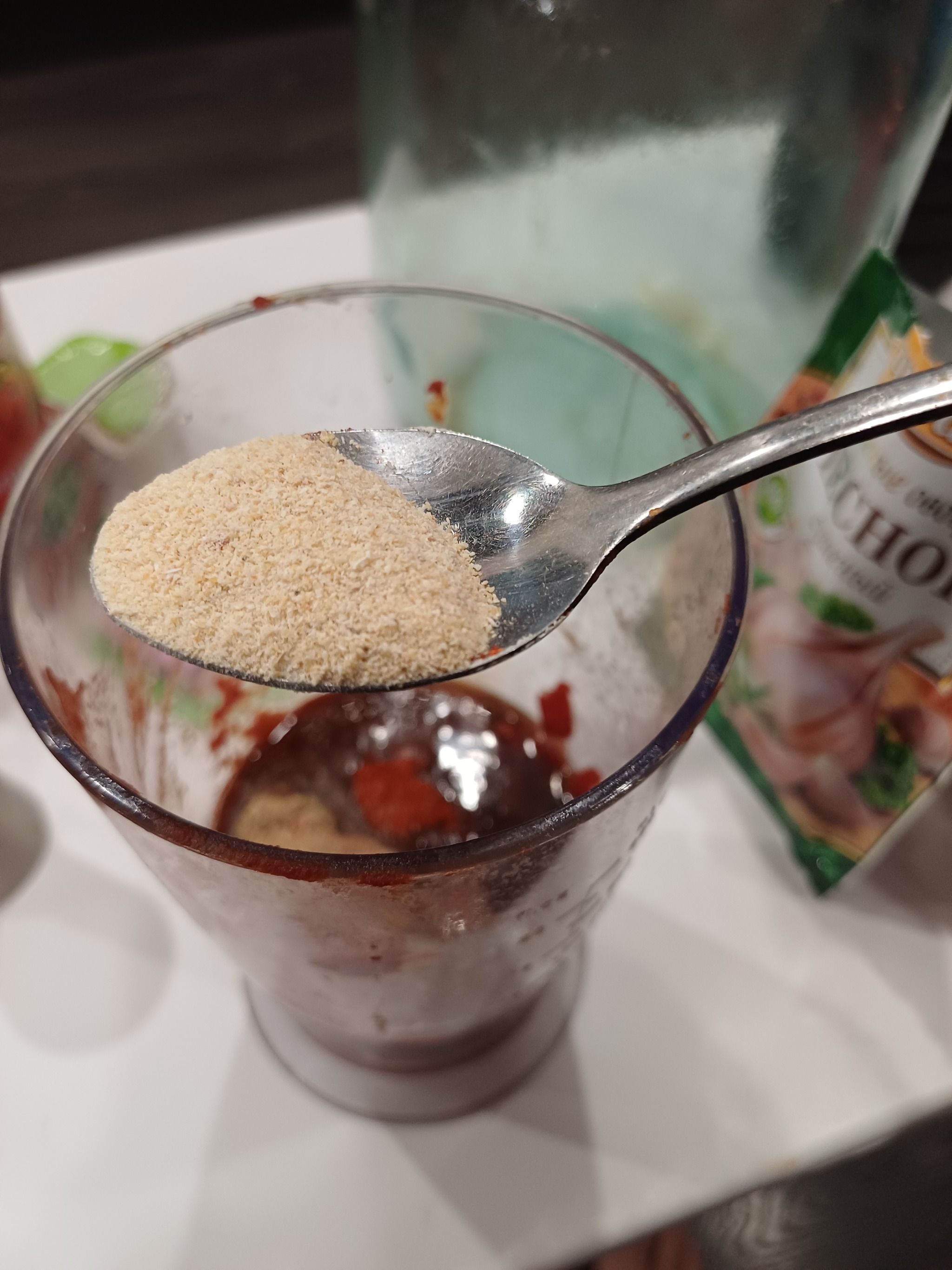 Специи в отдельную чашку по половине чайной ложки, заливаем кипятком только чтоб накрыть их. Оставляем остужаться. В отдельную чашку 100 мл соевового, 3 ложки чайных тобасско, 8 лимонного сока,перемешиваем. В 3х литровую банку закидываем пасту, 20 ложек чайных без горки,либо 200 грамм, туда соус, специи. Это все размешиваем добавляем пол банки пива, размешиваем, доливаем банку, размешиваем. И так все пиво, мешая после каждой банки, я мешал лопаткой деревянной.