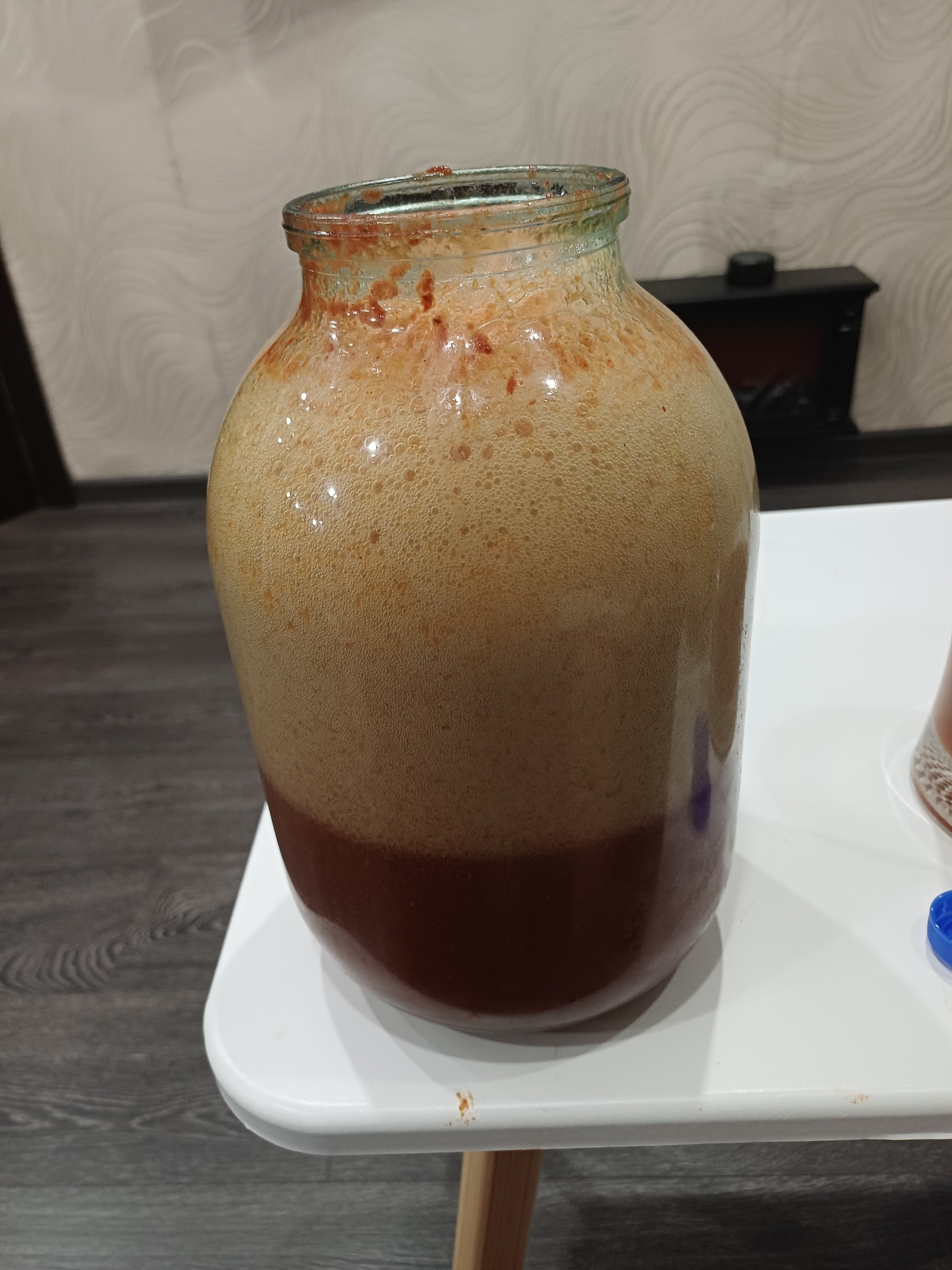 Теперь это в 3х литровую банку. Можно все не выскребать, а налить сюда пива, пополоскать и в банку, размешать и добавлять остальное пиво до почти конца банки, помешивая, будет много пены.