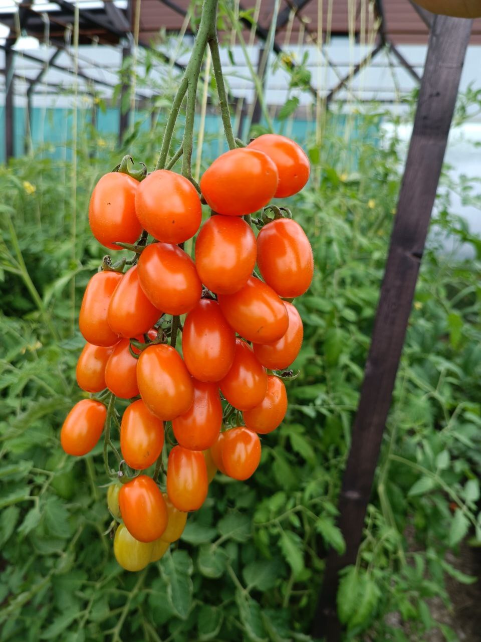 Еще один похожий томат - Ваше благородие - также красный, кистевой. Чуть заостренные вытянутые томаты, довольно крупные для черри. Сладкие. Сила роста куста большая, дорастает до крыш грядок и продолжает плодоносить до заморозков. Чем выше, тем мельче плоды.