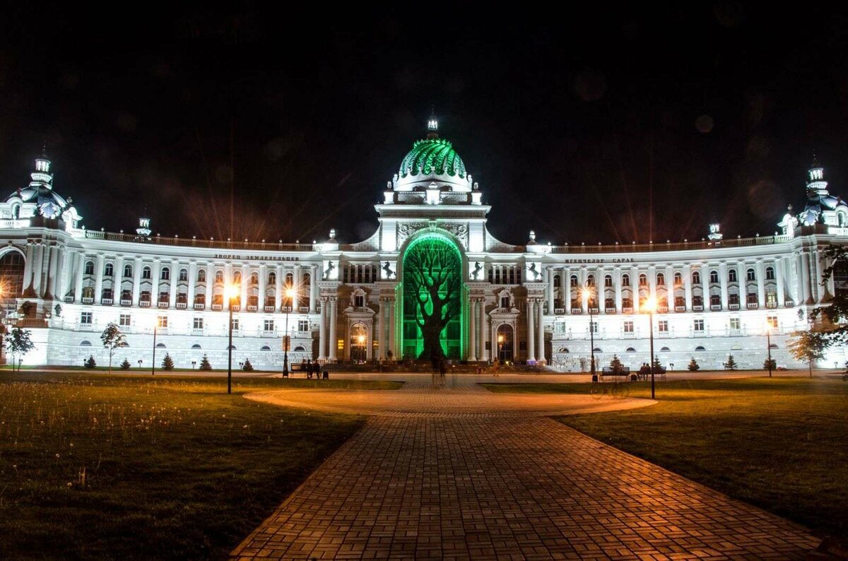 Одно из самых спорных и вместе с тем узнаваемых зданий Казани. Кто-то остается от него в полном восторге, кто-то считает его абсолютной безвкусицей. Но этот объект точно не оставит вас равнодушными. Центральным украшением здания является дерево – символ плодородия. По вечерам дерево подсвечивается зеленым светом. Перед Дворцом Земледельцев разбит небольшой парк с лавочками.