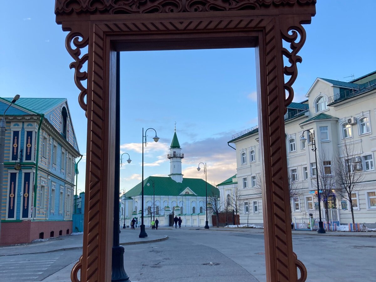 7.3. Памятник «Окно в Казань» - представляет собой оконный резной наличник, сделанный по подобию тех, что были когда-то установлены в Старо-Татарской слободе. Если немного поэкспериментировать с ракурсом, то внутри окна попадет мечеть Аль-Марджани.