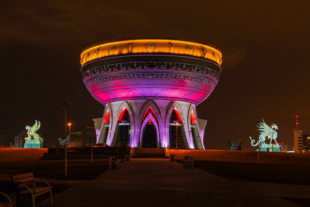 Мы постепенно перемещаемся на другой берег Казанки. Здесь расположена, пожалуй, самая необычная городская достопримечательность – главный дворец бракосочетаний. Здание имеет форму традиционного татарского казана — символа домашнего очага и достатка. Охраняют чашу фигуры белых барсов и зилантов.