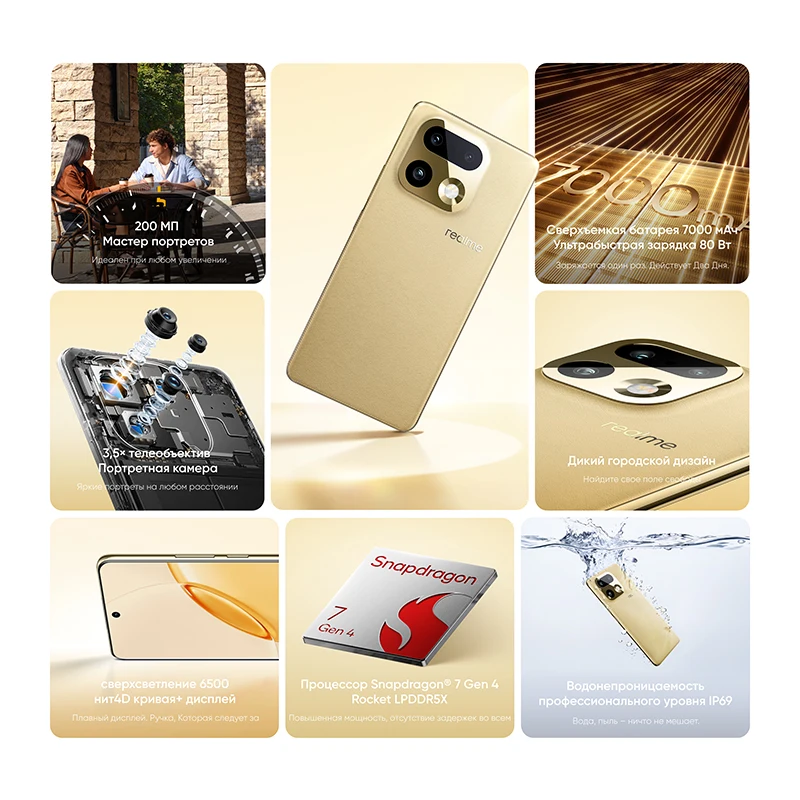Фотовозможности обеспечивает связка из 200-Мп основного модуля, 50-Мп перископического телевика с 3.5-кратным зумом и 8-Мп ширика. Фронталка на 50 Мп поддерживает запись 4K FullFocal HDR-видео. Батарея емкостью 7000 мАч заряжается блоком на 80 Вт, входящим в комплект. Аппарат работает на realme UI 7.0 (Android 15), имеет NFC, инфракрасный порт, оптический сканер в экране и защиту IP69. Поддерживаются двухрежимный 5G, Wi-Fi 6 и Bluetooth 5.4 с кодеками LDAC, aptX HD и LHDC 5.0.