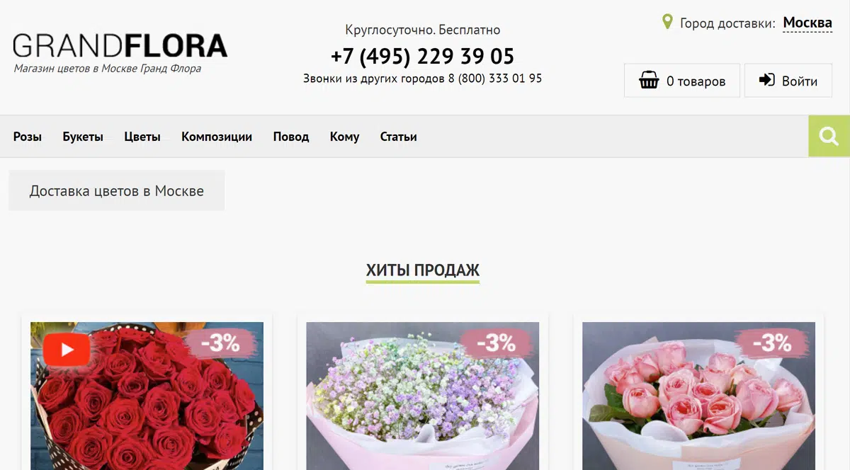 Grand-Flora – интернет-магазин, специализирующийся на доставке цветов и композиций по всей России. Основанный с миссией сделать покупку и доставку букетов максимально комфортной для клиентов, сервис предлагает широкий спектр флористических решений на любой случай. Вебсайт компании отличается интуитивно понятной навигацией и элегантным дизайном, что делает процесс заказа быстрым и удобным. Клиенты могут выбрать из обширного каталога букетов и композиций, а также воспользоваться услугой индивидуального подбора букета. Товары на платформе обновляются регулярно, обеспечивая свежесть и актуальность предложений. Кроме того, компания предлагает доставку в заранее указанное время, что позволяет клиентам планировать торжественные мероприятия без лишних хлопот. Пользователи отмечают высокий уровень обслуживания и профессионализм флористов Grand-Flora.