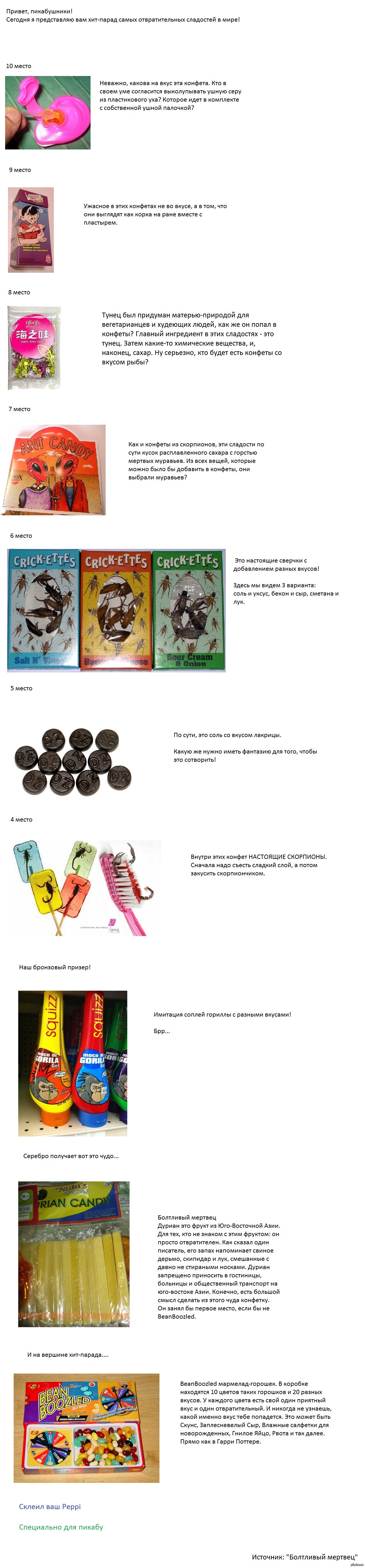 982 Peppi Топ-10 самых отвратительных конфет в мире! 12 лет назад Тут есть сладости, которые не понять совершенно, а породил их невероятно злой ум, но вот первое место я бы приобрел. [моё] Длиннопост Сладости Топ 10 Отвратительно