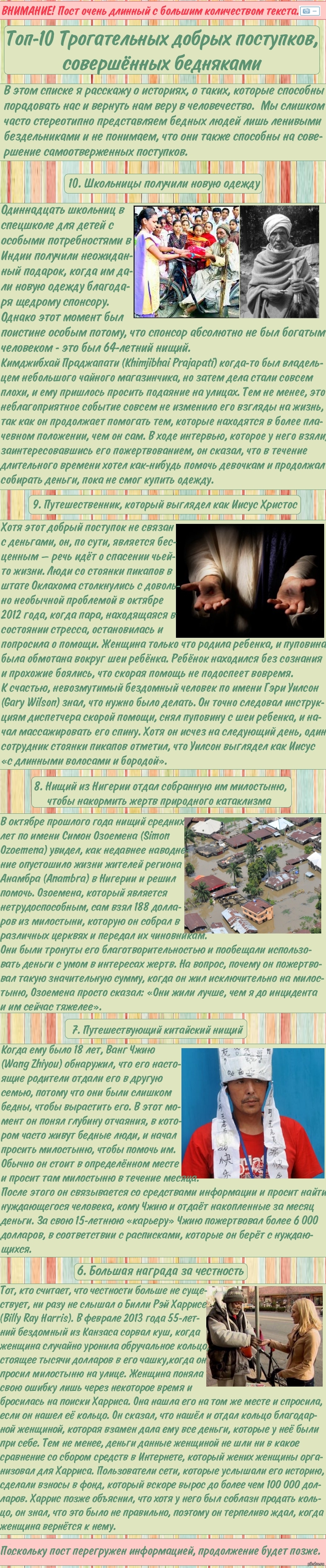 57 CreamDream 11 лет назад Топ-10 Трогательных добрых поступков, совершённых бедняками Продолжение в комментариях. Лига Добра Доброта Помощь Бедность Длиннопост