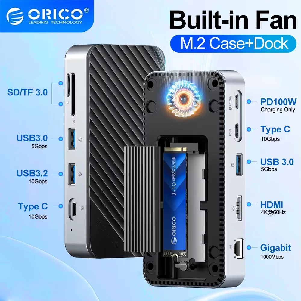 Универсальная док-станция с 10 портами и встроенным отсеком для M.2 SSD (поддерживаются как NVMe, так и SATA). Реализована система быстрого доступа к SSD благодаря магнитным фиксаторам.