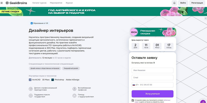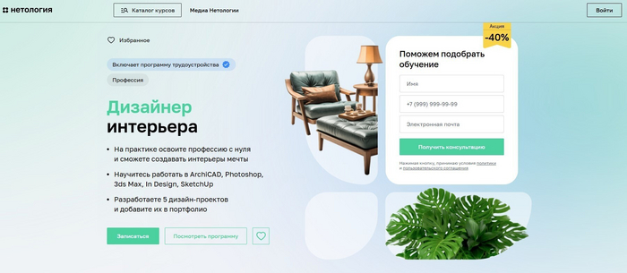 Нетология — одна из ведущих онлайн-школ в России, предлагающая курсы по различным цифровым профессиям. Их профессиональные курсы по дизайну интерьера помогают освоить все ключевые навыки, необходимые для работы в этой области.