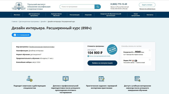 Программа: курс состоит из модулей, охватывающих проектирование интерьеров, создание 3D-визуализаций, дизайн жилых и коммерческих помещений, декорирование, материаловедение, взаимодействие с заказчиком.