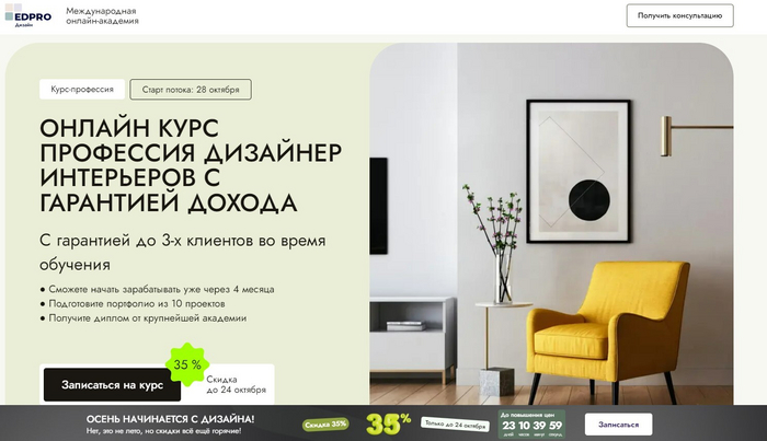 EdPro — это онлайн-платформа, предлагающая курсы дополнительного профессионального образования в различных направлениях, включая дизайн интерьера. Курс «Дизайн интерьера» предназначен для тех, кто хочет освоить профессию дизайнера интерьеров с нуля.