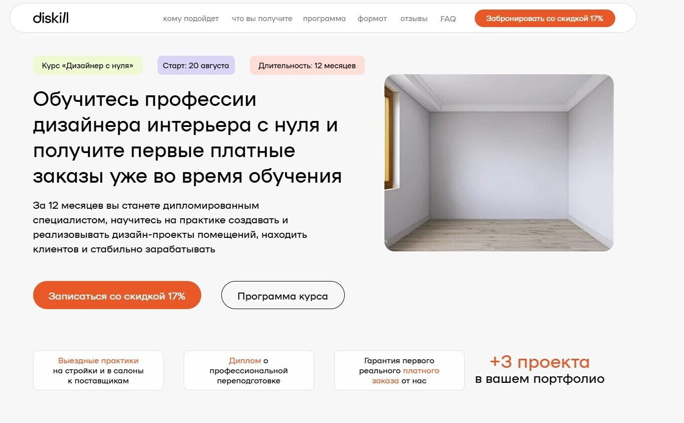 «Дискилл» специализируется на онлайн-обучении в различных креативных и технических направлениях, включая дизайн интерьера. Курсы ориентированы на освоение профессии с нуля и получение практических навыков.