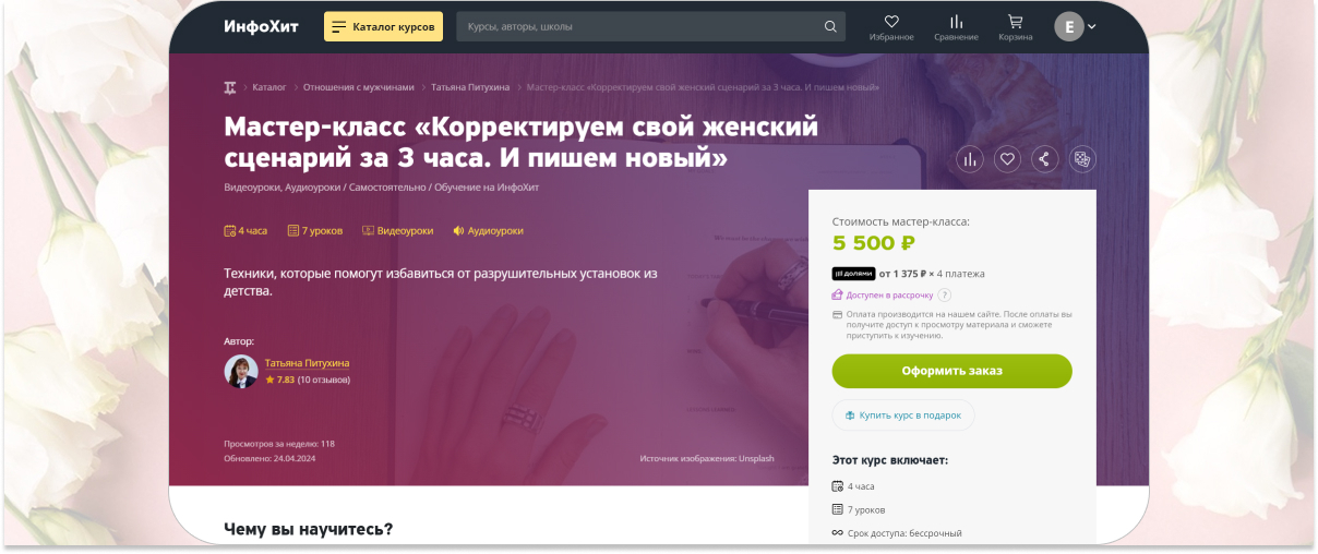 Мастер-класс рассчитан всего на 4 часа и включает 7 уроков. Срок доступа к материалам курса бессрочный, а доступ открывается сразу после оплаты.