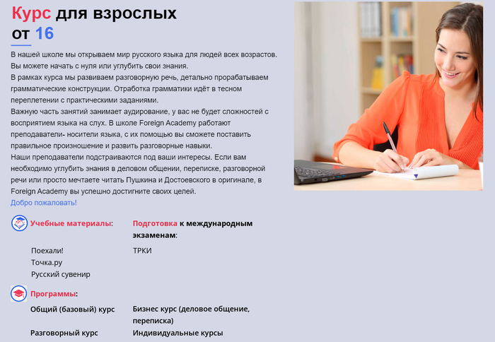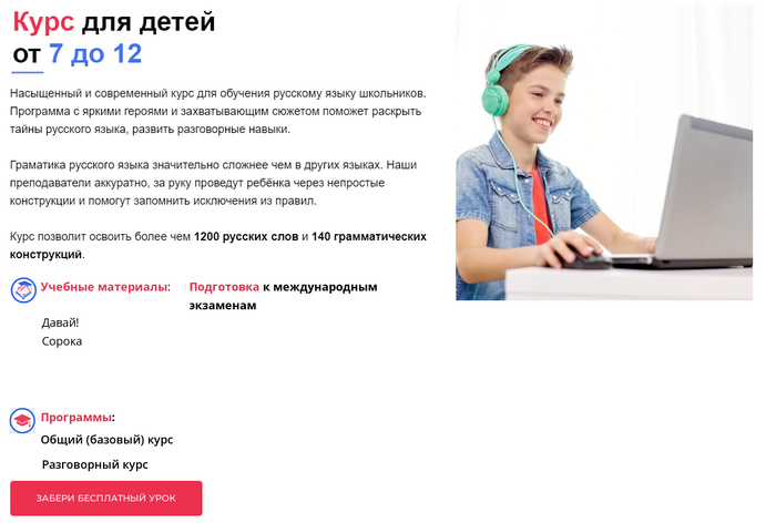 Сайт предлагает различные программы для изучения языка иностранными гражданами. Уроки направлены на развитие устной и письменной речи, чтения и аудирования. В занятия входит основная программа, «Survival Russian», деловой русский и специализированные курсы для разных сфер деятельности. Преподавание ведется с учетом индивидуальных особенностей и пожеланий студентов.
