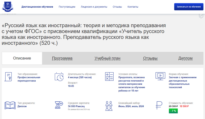 Школа предлагает профессиональную переподготовку. Цель — сформировать у обучающихся компетенции для профессиональной деятельности в образовательной организации в соответствии с требованиями ФГОС. Подходит для специалистов с высшим филологическим и педагогическим образованием. По окончании вы получите диплом установленного образца с присвоением квалификации «Учитель русского языка как иностранного. Преподаватель русского языка как иностранного».