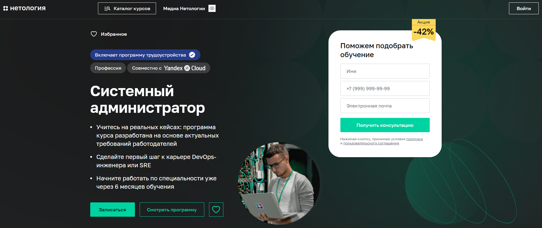 Этот курс — часть расширенной программы «DevOps‑инженер с нуля». Подходит для учеников без опыта работы и знаний в области системного администрирования. На курсе вы научитесь администрировать Linux, разбираться в компьютерных сетях, определять и устранять основные угрозы информационной безопасности. В разработке программы участвовали эксперты Yandex Cloud, также участников курса ждут задания от партнеров «Нетологии», возможность пройти стажировку и найти работу по специальности после 6 месяцев обучения.