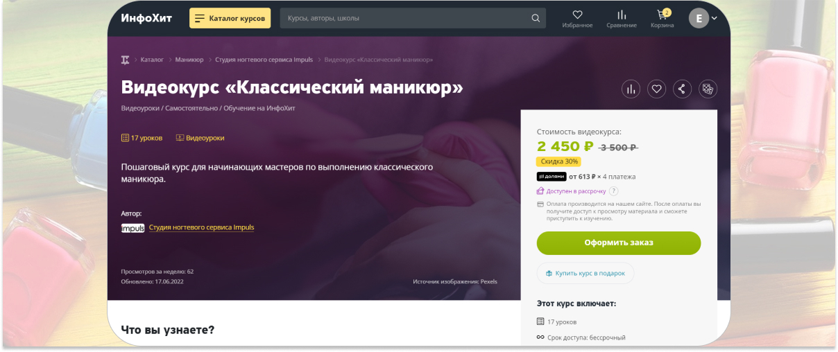 Возможность овладеть навыками создания востребованных дизайнов, расширения арсенала новой услуги для увеличения среднего чека доступна на онлайн-курсе, старт которого следует за оплатой. Обучающая программа разработана опытными мастерами с многолетней практикой в индустрии. За время обучения студенты пополнят портфолио новыми работами.