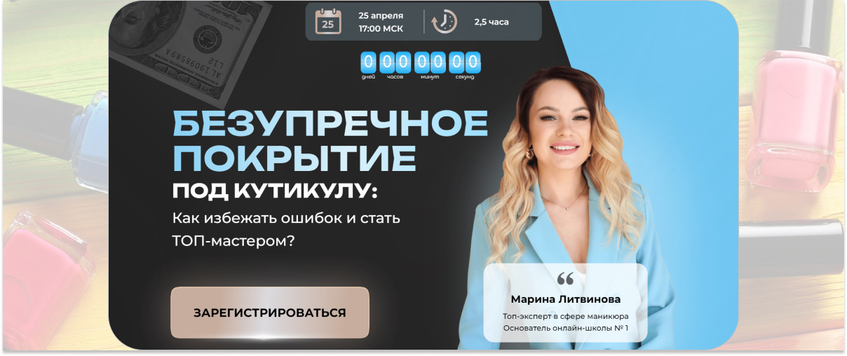 Бесплатный вебинар по маникюру подходит мастерам, которые хотят увеличить доход, и начинающим специалистам. На мастер-классе студентам расскажут об основных ошибках во время покрытия и способах их исправления.