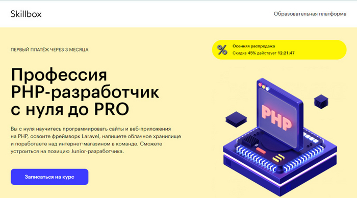 Профессия PHP-разработчик с нуля до PRO от Skillbox — быстрый старт в карьере; начнете работать на позиции джуна уже через 7 месяцев.