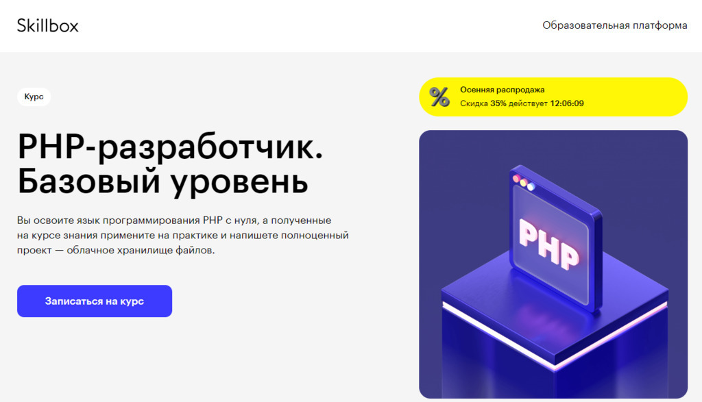PHP-разработчик. Базовый уровень от Skillbox — подходит для базового знакомства с языком.