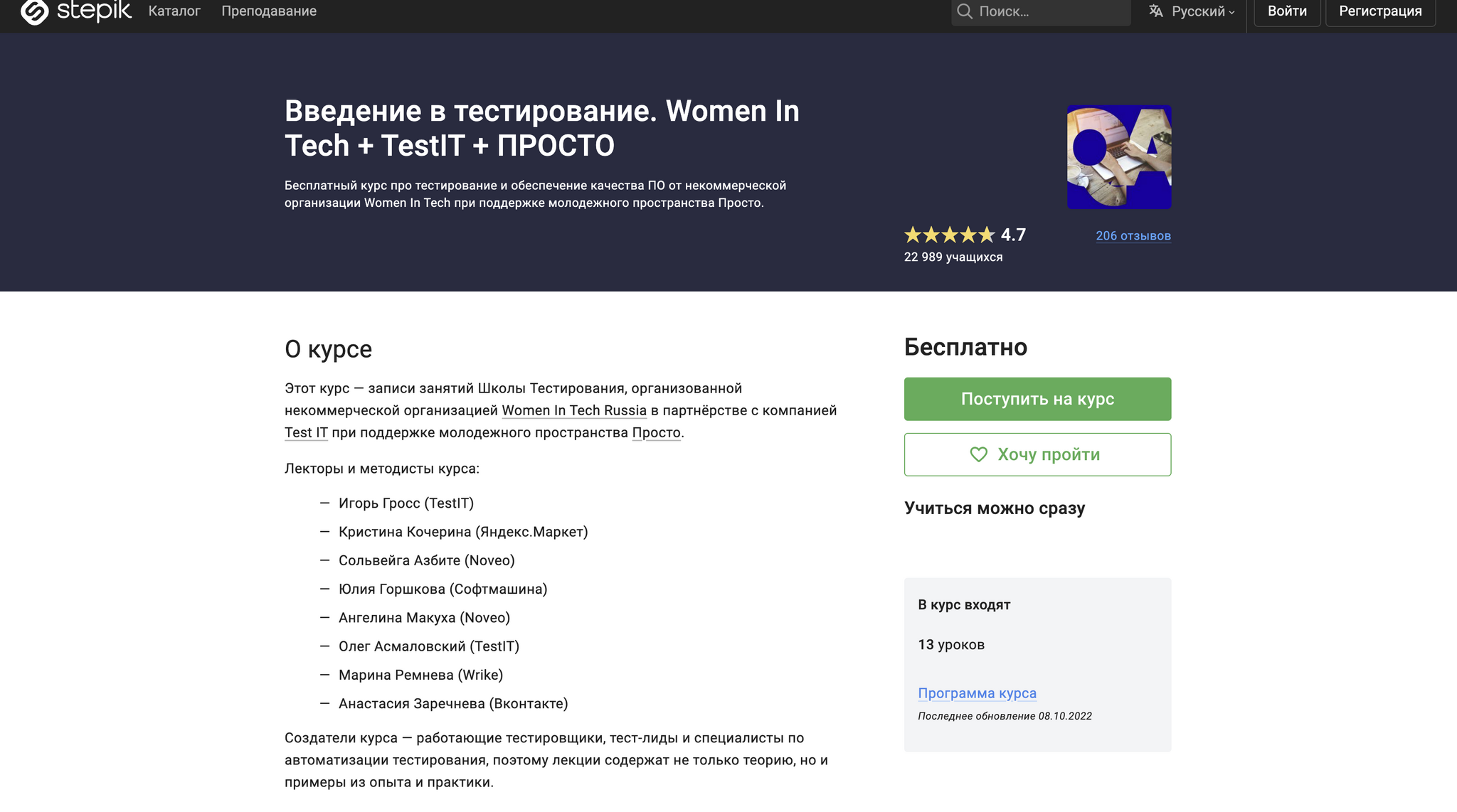 Курс поможет школьникам войти в IT через тестирование. Лекторы и методисты — практикующие тестировщики, тест-лиды и эксперты по автоматизации тестирования.