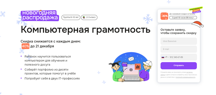 Онлайн-курс предназначен для детей и подростков. Поможет учащимся освоить основные навыки работы с компьютером и интернетом, а также научит использованию популярных программ, таких как Word, Excel, Paint 3D и PowerPoint. В процессе обучения ученики создадут четыре проекта: открытку, кроссворд, игру и видео. Программа курса включает также обучение безопасному использованию интернета и защите от мошенников. По завершении курса учащиеся получат сертификат.