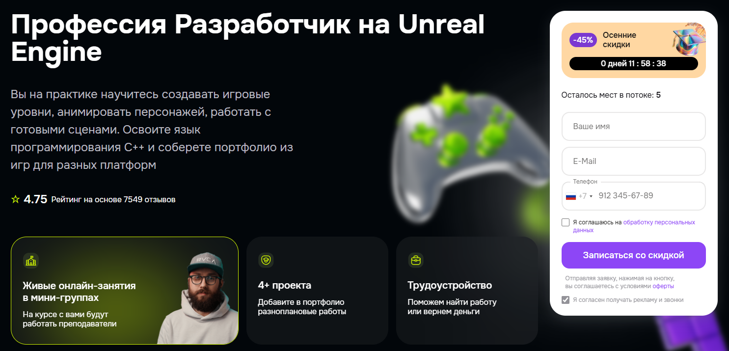 Разработчик игр на Unreal Engine 5 от Skillbox — на прохождение курса понадобится от 8 до 16 месяцев. Длительность зависит от личной загруженности и выбора дополнительных модулей программы. Сначала студенты обучаются no-code-разработке (без программирования), затем переходят на С++. По частям можно купить курс за 5 825 рублей в месяц. Причем первый взнос только через полгода обучения. К тому времени ученики уже могут начинать зарабатывать на разработке.