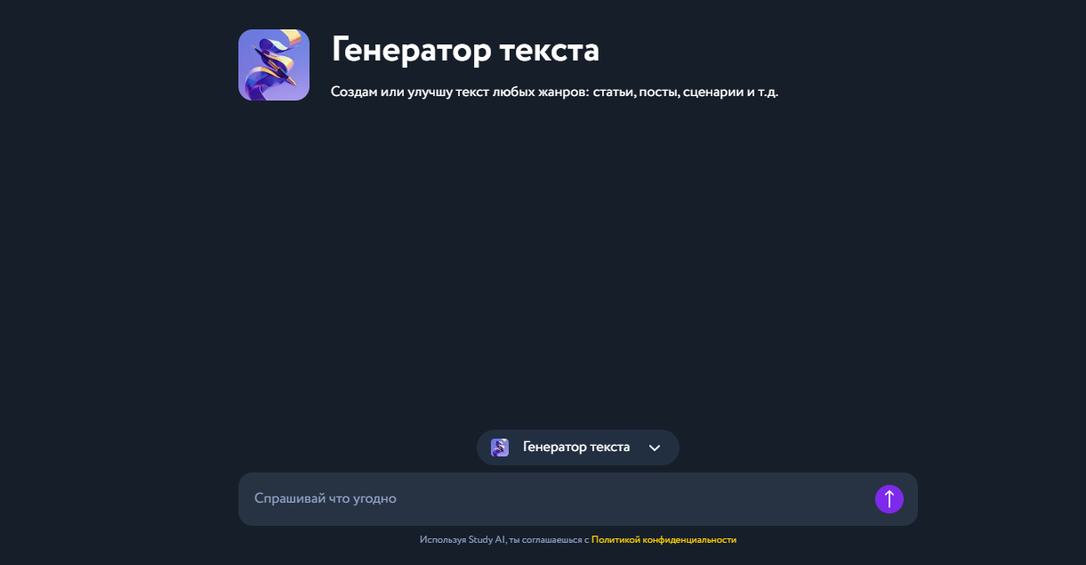 Study AI — многофункциональный ИИ-сервис, где можно быстро получить черновик ВКР, эссе, доклада.