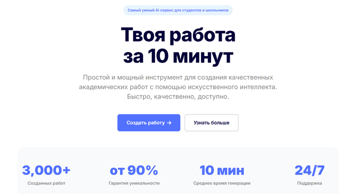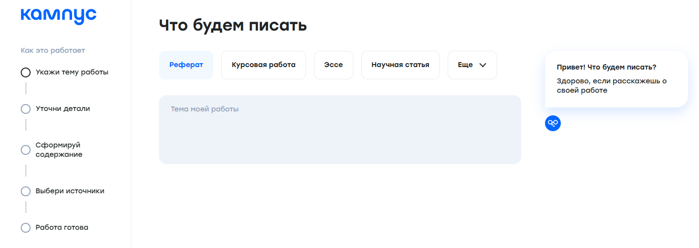 Интегрированная нейросеть от одноименной образовательной платформы помогает писать связные тексты по заданной теме: план, тезисы, введение, основные части и вывод — все в течение нескольких минут, ориентируясь на академические требования и стиль работы студента. Благодаря этому ИИ-сервису пользователи быстро получают структурированную основу для учебных работ. Готовый текст требует осмысления и редактирования.