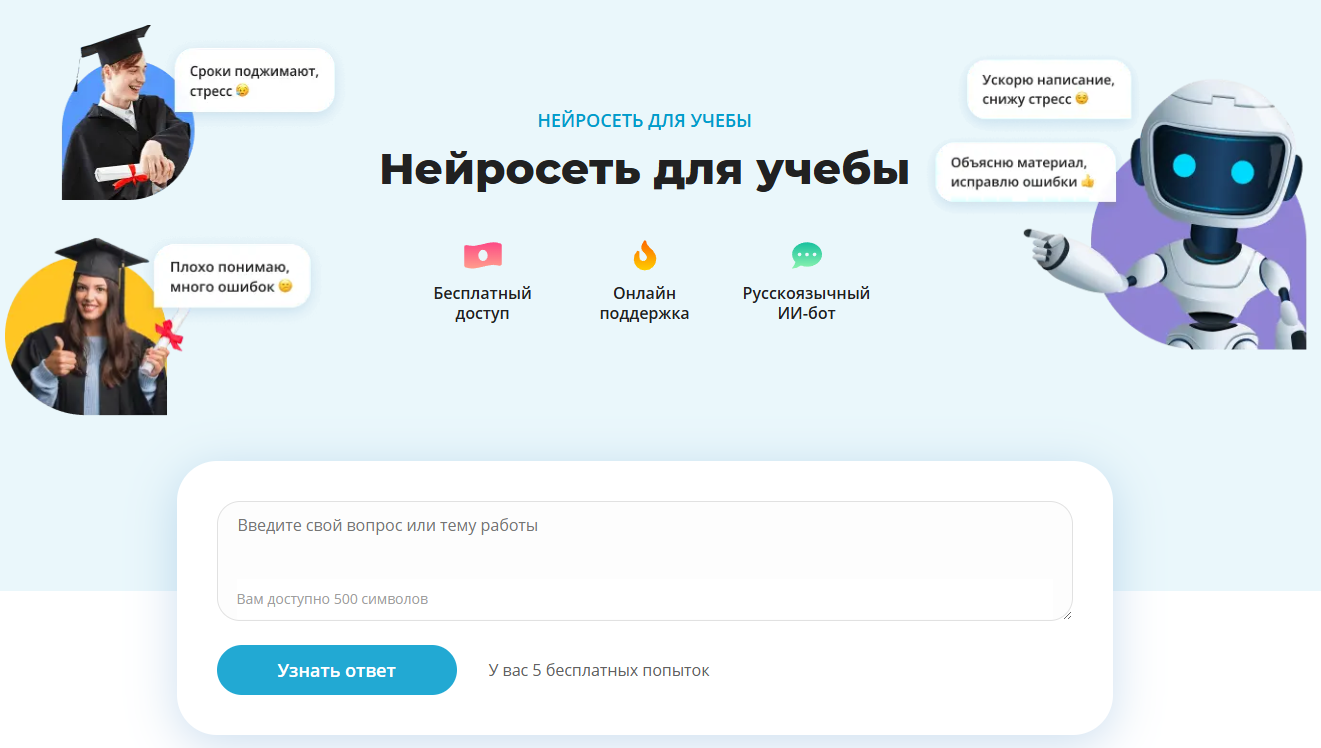 Этому инструменту ИИ для помощи в учебе можно задать тему, стиль и длину текста на русском языке. Он помогает структурировать материал: подготовить план, вступление и тезисы. Сервис экономит ваше время и позволяет быстро получить основу проекта, которую потом можно доработать самостоятельно.