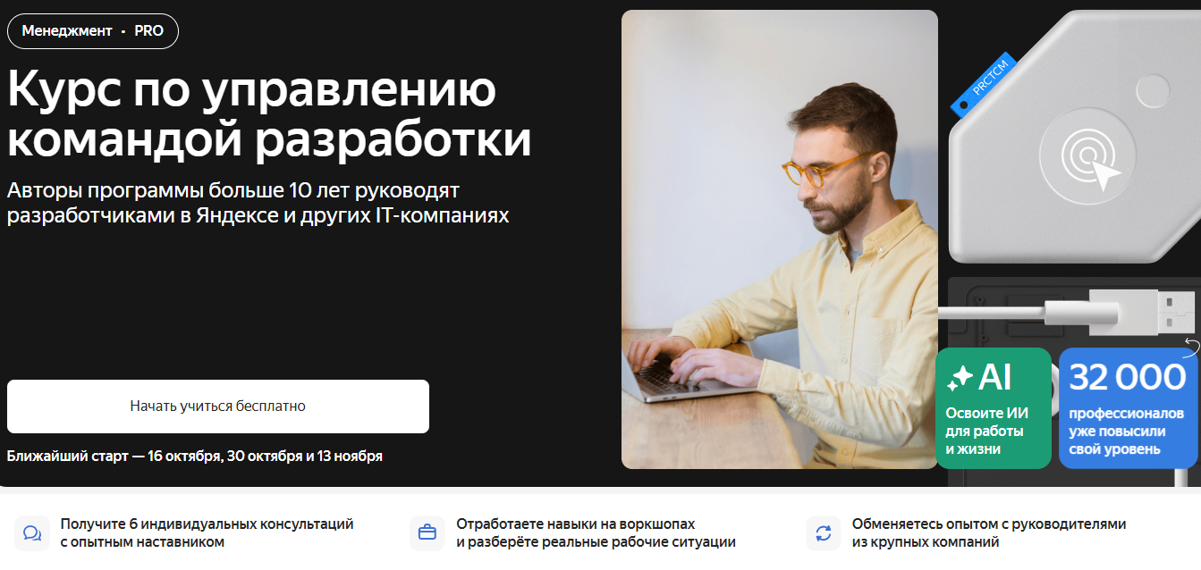 Курс по управлению командой от Яндекс Практикума — мотивация сотрудников и управление процессами с использованием Scrum и Kanban.