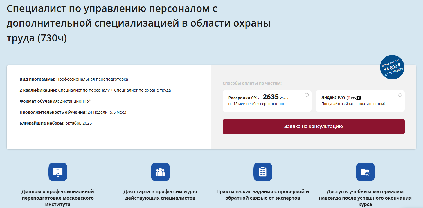 Специалист по управлению персоналом с дополнительной специализацией в области охраны труда от АНО «НИИДПО» — диплом по двум специальностям: кадровое делопроизводство и охрана труда «под ключ».