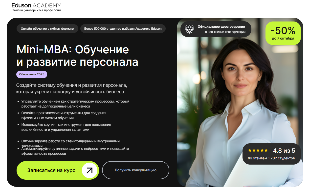Mini MBA: Обучение и развитие персонала от Eduson Academy — стратегический L&D-менеджер, влияющий на бизнес-метрики, три дополнительных курса в подарок.