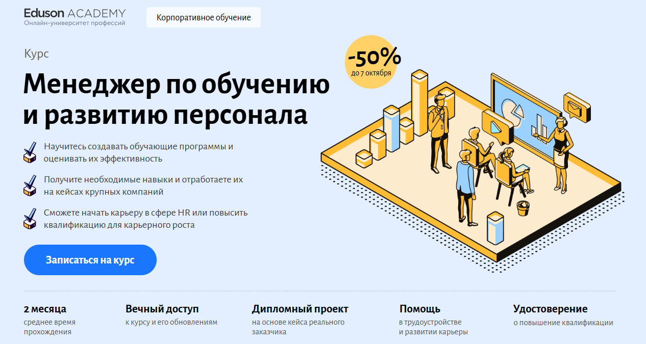 Менеджер по обучению и развитию персонала от Eduson Academy — полный цикл управления L&D, от анализа потребностей до оценки ROI, с пожизненным доступом к материалам и дипломом по реальному кейсу.