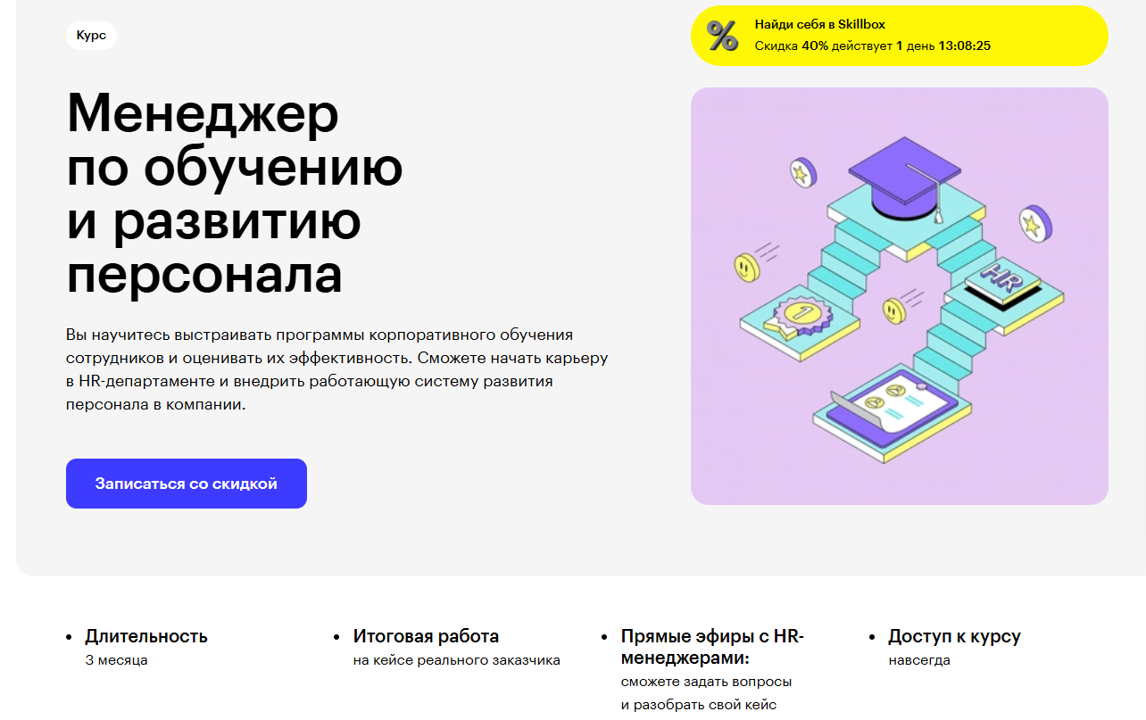 Менеджер по онлайн-обучению и развитию персонала от Skillbox.ru — доказанная эффективность обучения с использованием AI, карьерные консультации и прямые эфиры с HR-менеджерами.