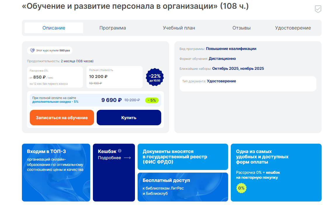 Менеджер по онлайн-обучению и развитию персонала от Учебного центра «НЦПО». Вы освоите современные подходы к созданию корпоративного университета, внедрите геймификацию и микрообучение — это поможет удерживать внимание сотрудников и значительно повысит усвоение материала.