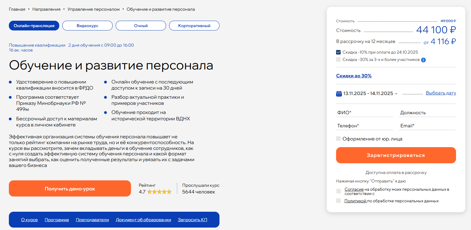 Обучение и развитие персонала в организации от НАДПО — системный подход к L&D от диагностики до оценки эффективности, преподаватели-практики и трудоустройство.