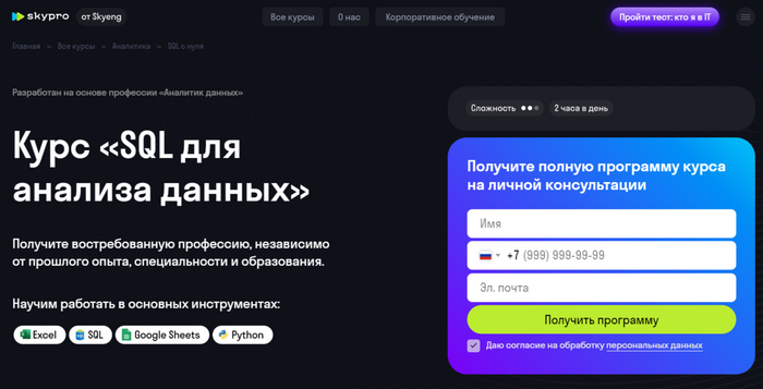 Формат обучения: теория, практика, вебинары и чат с наставником, работа на тренажере с автопроверкой, проектная работа на основании реальных задач с проверкой от эксперта в SQL.