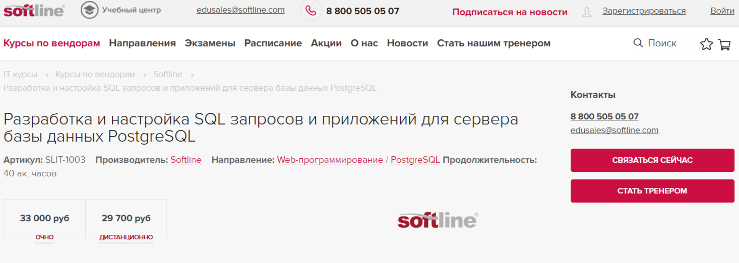 Разработка и настройка SQL запросов и приложений для сервера базы данных PostgreSQL от Softline – лучший интенсив, доступный очно и онлайн.