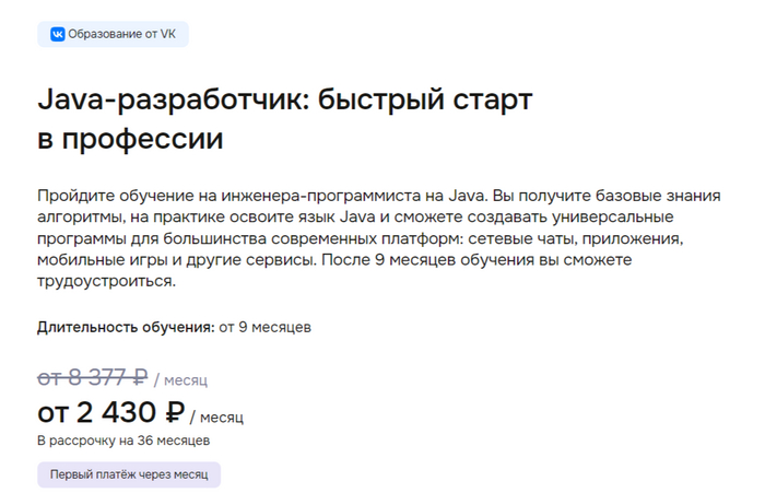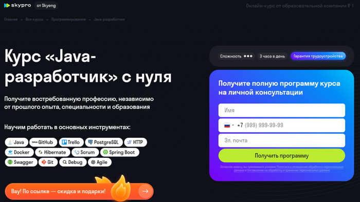 Профессия: Java-разработчикот ProductStar. Курс поможет вам освоить программирование на Java и стать востребованным специалистом в IT-компаниях. За 18 месяцев обучения (с возможностью интенсивного режима) вы овладеете всеми необходимыми навыками разработки на Java и создадите сильные проекты для своего портфолио. Компания предлагает трудоустройство во время процесса обучения или возврат средств. Спикерами курса являются эксперты из таких компаний, как Amazon, Yandex и Skyeng.