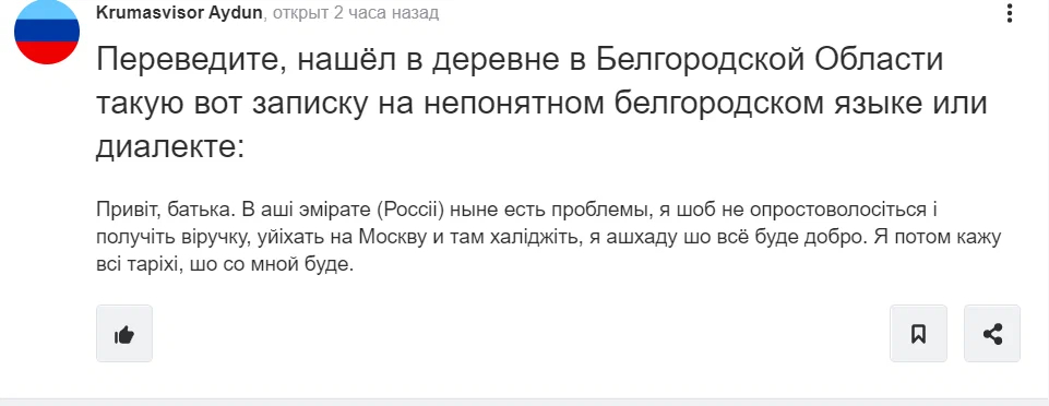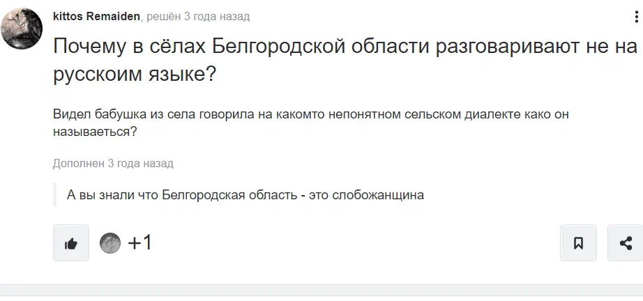 Белгородский диалект - язык на котором говорят в некоторых деревнях Бел. области, сильно отличающийся как от русского так и украинского.