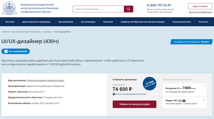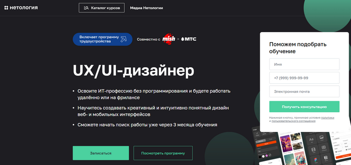 Профессия UX/UI дизайнер от Нетология — самое обширное изучение основ и базовых навыков профессии с помощью в трудоустройстве.