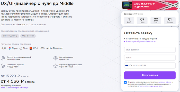 Курс для студентов разного уровня подготовки. Программа научит базовым навыкам, необходимым для успешной карьеры дизайнера. В течение всего курса пользователи будут изучать разные темы и научатся: создавать интерфейс продукта, анализировать сайты с точки зрения улучшения дизайна и увеличения конверсии. Также студенты смогут находить баланс между желаниями заказчика и пользователя, создавать актуальный веб и мобильный дизайн, разбираться в проектировании и UX‑аналитике, проводить исследование целевой аудитории, разрабатывать интерфейсы, составлять архитектуру карты пользователя, презентовать проекты.