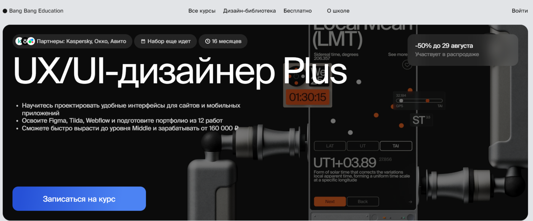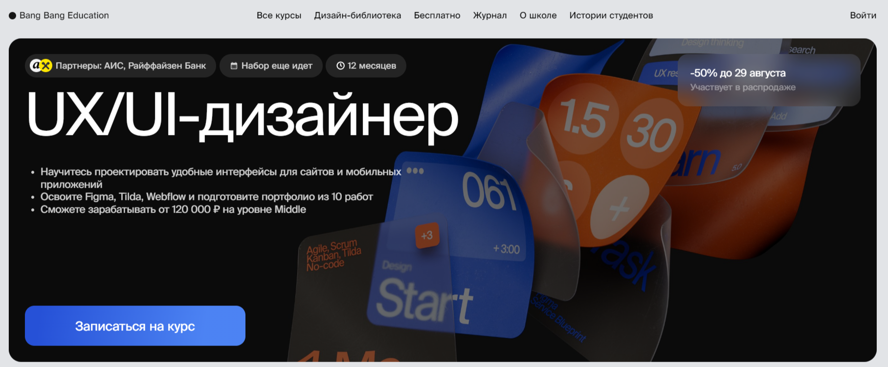 Курс UX/UI: дизайн цифровых продуктов от Bang Bang Education. Продвинутые курсы для дизайнеров, которые позволят научиться проектировать удобные интерфейсы для сайтов и мобильных приложений, освоить Figma, Tilda, Webflow и подготовить портфолио из 5 проектов.