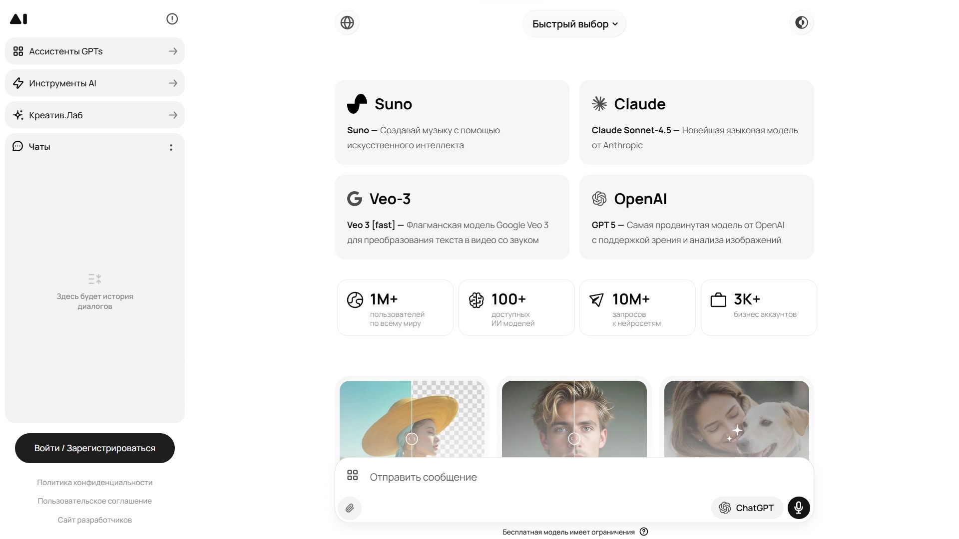 На сайте заявлен доступ к широкому спектру популярных моделей, включая ChatGPT, Claude, Midjourney и другие. Однако, учитывая бесплатный характер сервиса, с высокой долей вероятности пользователи получают доступ к базовым, менее мощным или ограниченным по скорости версиям этих нейросетей.