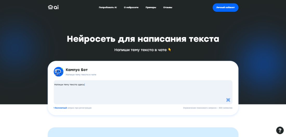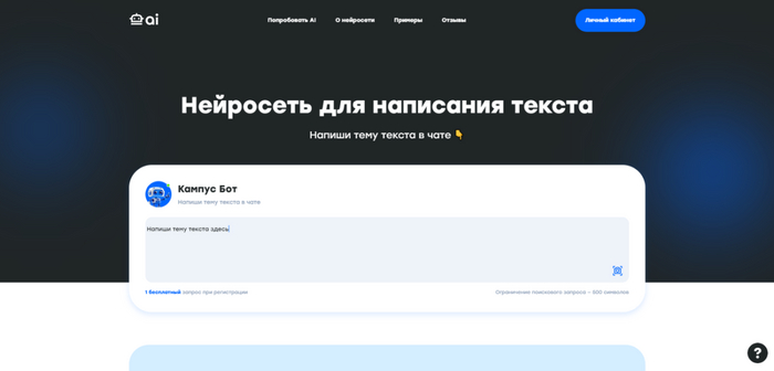 Кампус AI предлагает студентам по всему миру уникальный набор инструментов на базе искусственного интеллекта, специально разработанных для оптимизации учебного процесса. Платформа предоставляет возможность сотрудничать с экспертами и использовать ИИ на полную мощность. Среди функций Кампуса AI — решения, которые облегчают выполнение учебных заданий, ускоряют поиск информации и способствуют созданию активного студенческого сообщества. Платформа также предлагает сервис проверки текстов, созданных с использованием ИИ, с участием специалистов, обладающих глубокими знаниями в различных областях.
