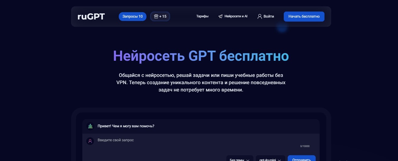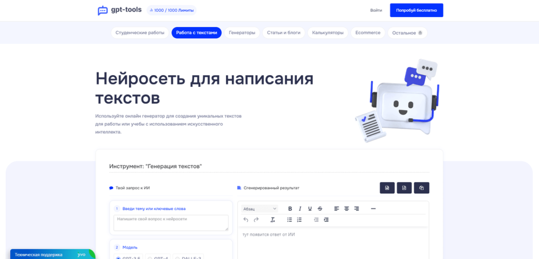 Бесплатные лимиты: Сервис предлагает пользователям бесплатные лимиты на генерацию текстов, что позволяет сэкономить время и средства.