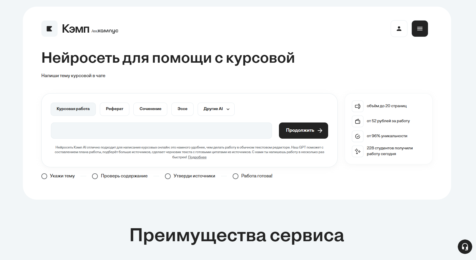 Кэмп AI — это продвинутая нейросеть для написания курсовых, рефератов, сочинений и других учебных работ онлайн. Сервис основан на архитектуре GPT и специально адаптирован под студентов российских вузов. Он помогает составить план, оглавление, введение, подобрать источники, оформить цитаты и создать черновик основной части курсовой. Кэмп AI анализирует запрос, подбирает актуальные данные из учебников и статей, пишет живым и понятным языком, а также объясняет решения и оформление по ГОСТу. Всё работает онлайн — без VPN, ограничений и сложных настроек.