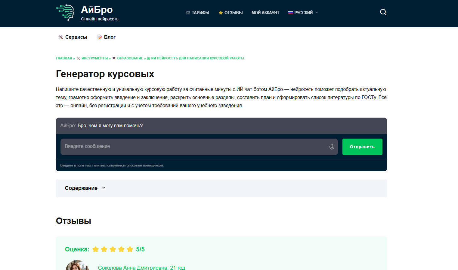 АйБро — это нейросеть и онлайн-чат-бот на базе искусственного интеллекта, созданный для помощи студентам и школьникам в написании курсовых работ. Сервис подбирает актуальные темы, формирует структуру по ГОСТу, оформляет введение, основную часть и заключение, добавляет список литературы и помогает выстроить логику изложения. Всё происходит автоматически — онлайн, без регистрации, с учётом требований учебного заведения и академического стиля. АйБро понимает запросы на русском языке и выступает настоящим помощником в подготовке качественных учебных материалов любого уровня сложности.