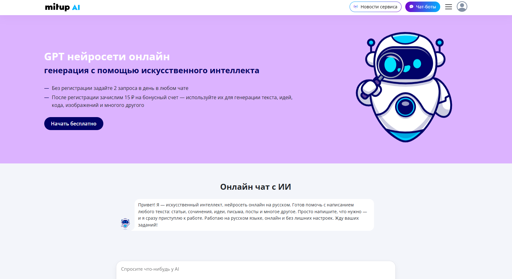 MitupAI — это агрегатор нейросетей, объединяющий самые популярные модели искусственного интеллекта (ChatGPT, DeepSeek, Gemini, Grok, GigaChat, YandexGPT) в одном онлайн-чате. Сервис позволяет создавать тексты, изображения, код и идеи без VPN, регистрации и сложных настроек. Пользователь может переключаться между нейросетями, прикреплять файлы для анализа и даже использовать API для автоматизации генерации контента.