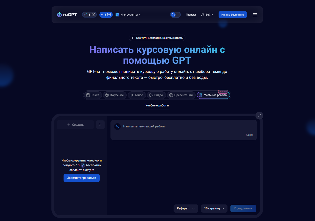 ruGPT io — это агрегатор нейросетей, объединяющий самые передовые модели искусственного интеллекта, включая GPT-5, Claude, DeepSeek, Gemini и другие. Платформа позволяет работать с текстами, изображениями, голосом и видео прямо в браузере — без VPN, регистрации и ограничений. Для студентов это удобный инструмент, который помогает создавать курсовые, рефераты, дипломные и другие учебные работы быстро и качественно.